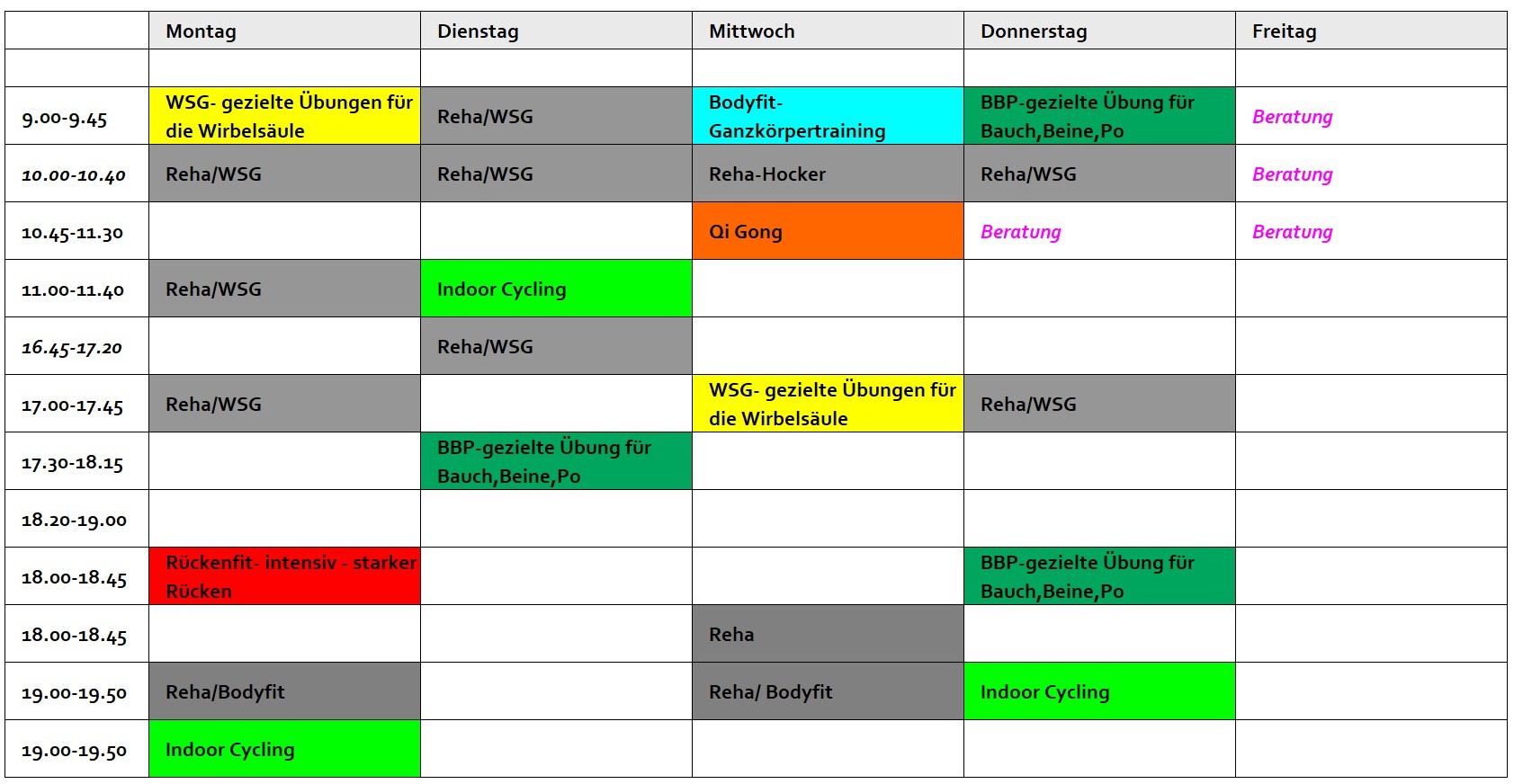 Bei uns steht das Training im Team im Vordergrund! Unser gemeinsames Trainingsziel: Gesundheit. Du willst fit und Gesund bleiben? Ob Rückenfit, Bauch Beine Po, Wirbelsäulengynastik, Yoga/Pilates, Wassergymnastik und Rehasport. Diese Kurse unterstützen Dich bei Deinem Trainingsziel für Dein persönliches Wohlbefinden und mehr Gesundheit! Gemeinsam im Team sind wir stark!